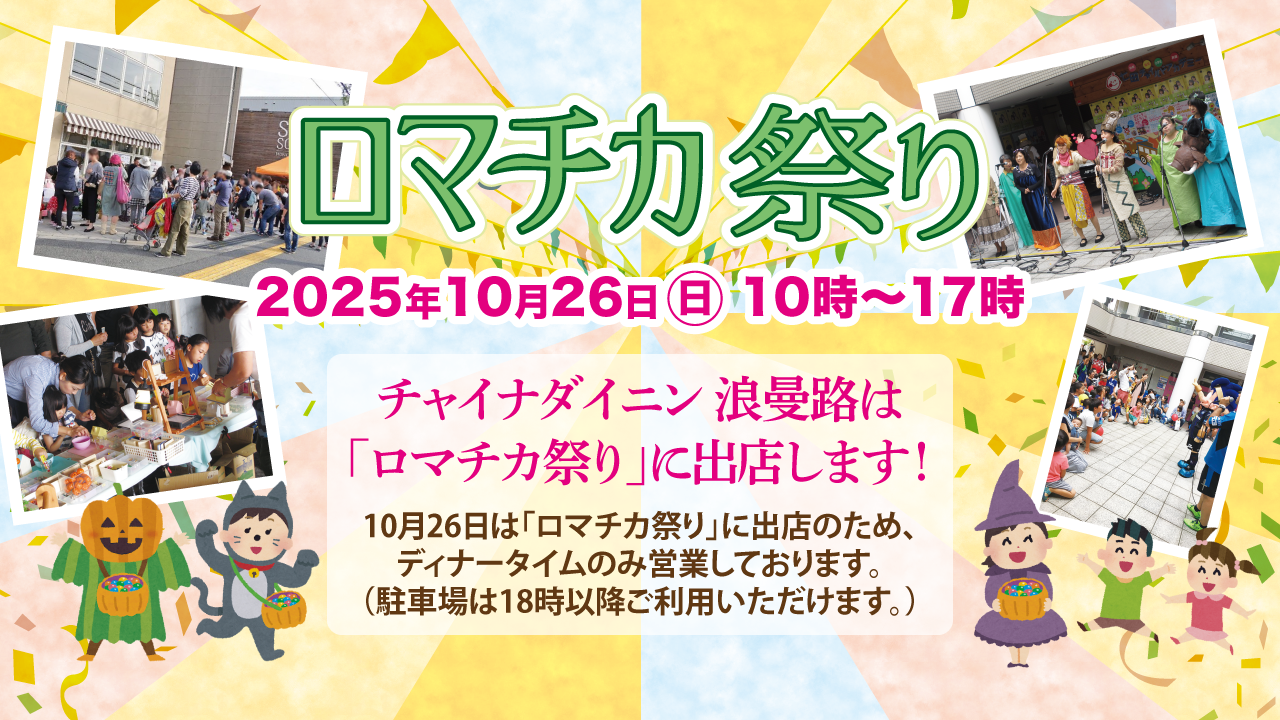 10/26は「ロマチカ祭り」に出店のため、ディナータイムのみの営業となります